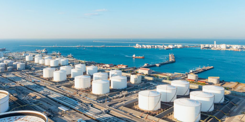 The terminal features a mix of carbon steel and stainless steel atmospheric tanks, designed with: